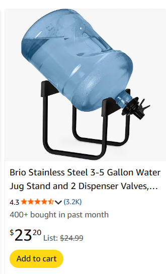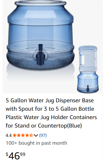 This simple stand holds your water jug up to make it easy to fill cups or pans. It comes apart for low cost shipping by taking the vertical tubes out of their pockets on top and bottom. The stand is sturdy enough to withstand mild earthquakes. And there is no base jug to need cleaning and to add shipping cost. Compare it to the others on line in the pictures shown.